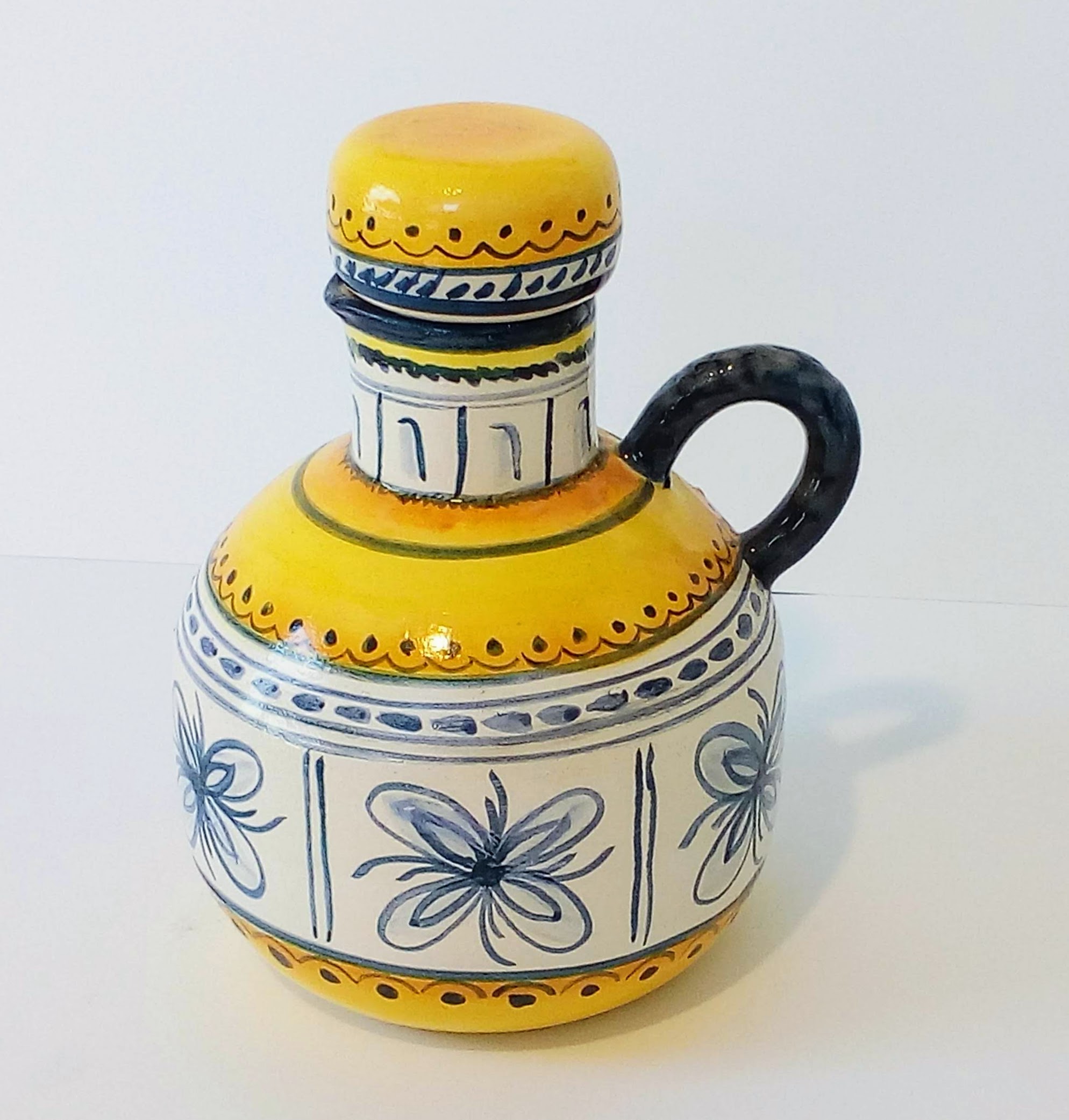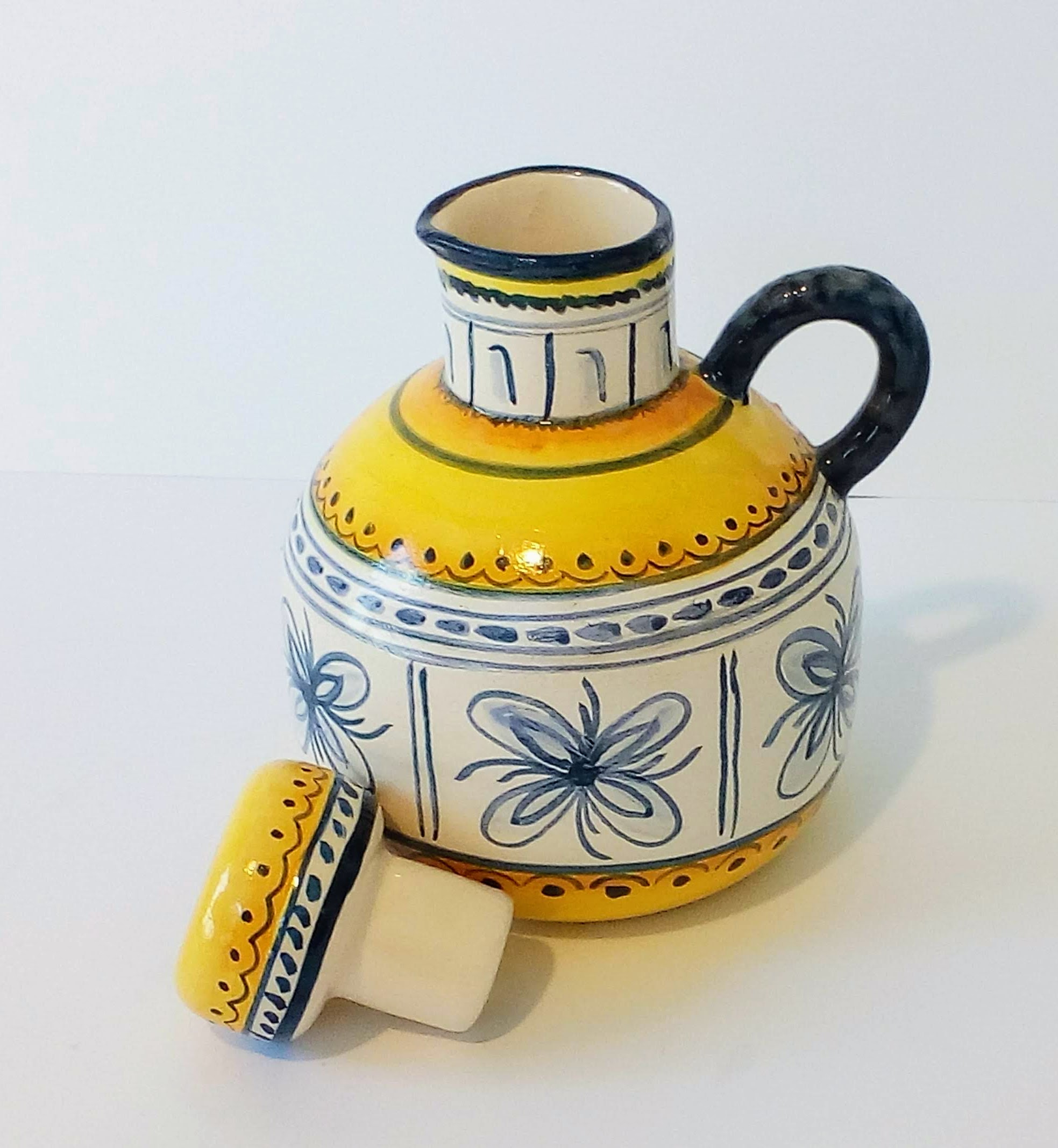 Botijo con tapa de cerámica pintado a mano. Técnica bajo cubierta