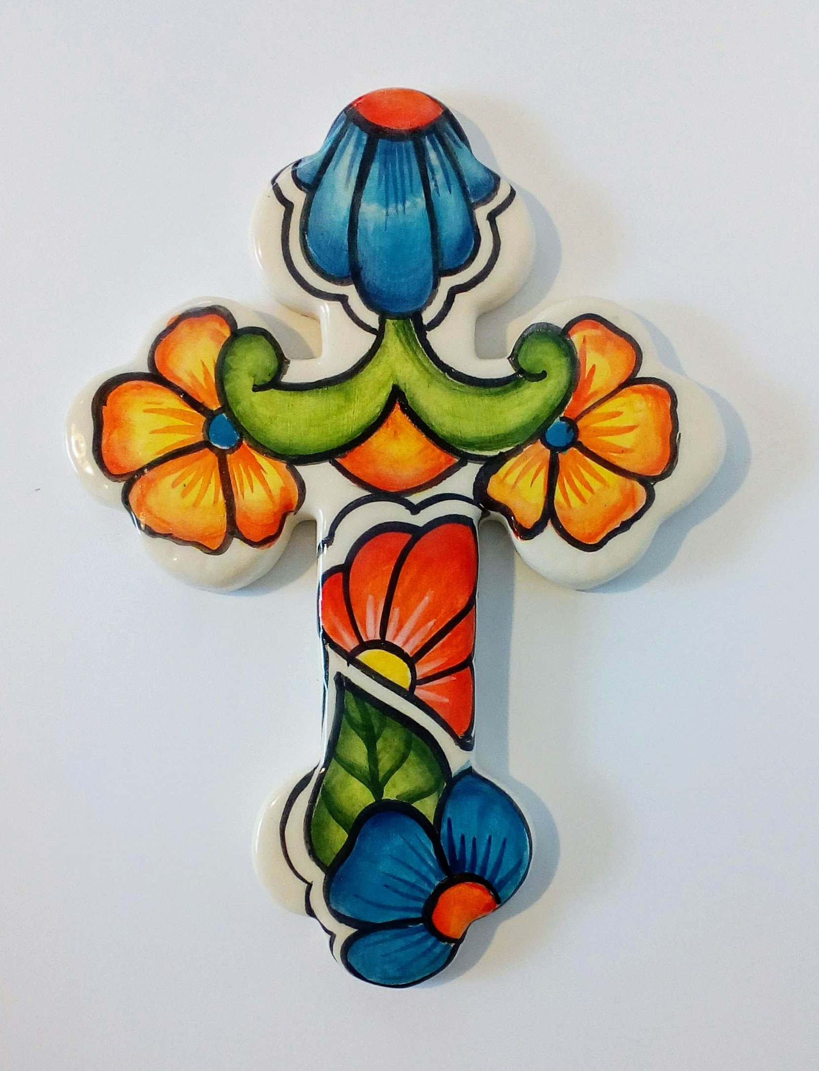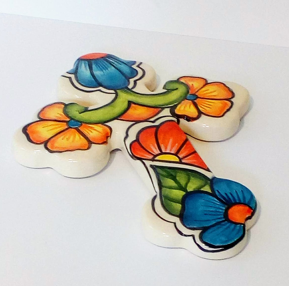 Cruz de cerámica pintado a mano. Técnica bajo cubierta.
