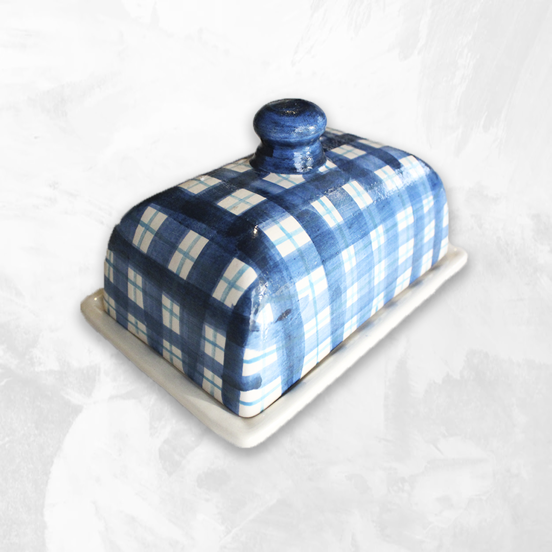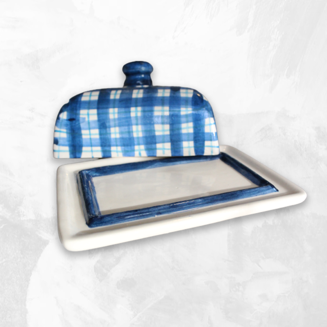 Mantequera de cerámica pintado a mano. Técnica bajo cubierta.
